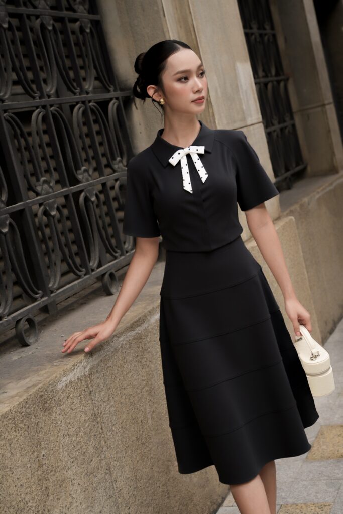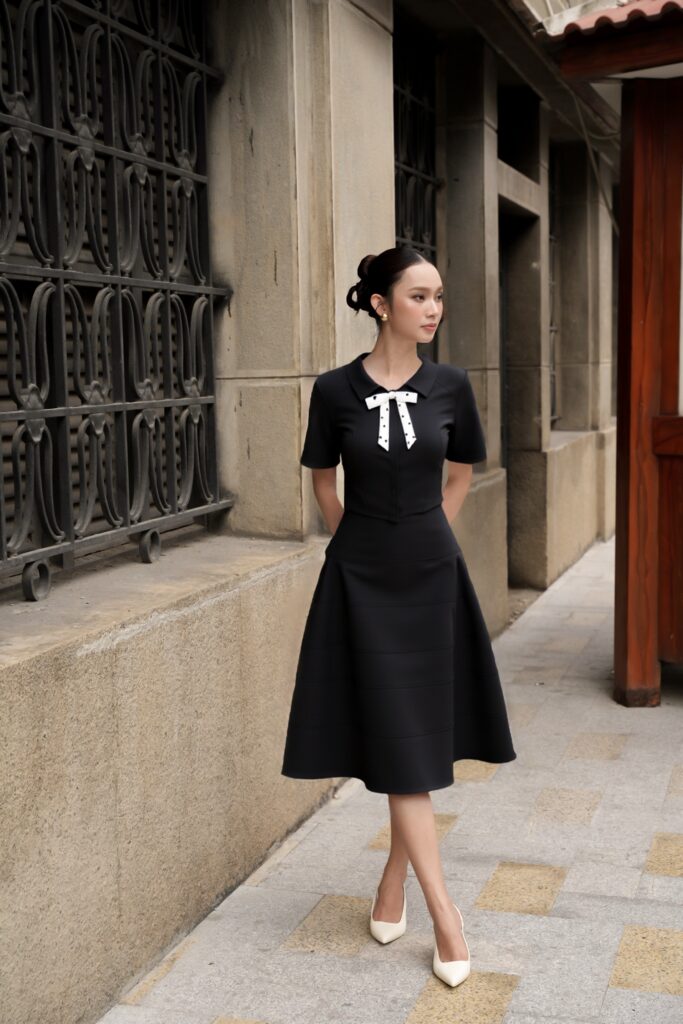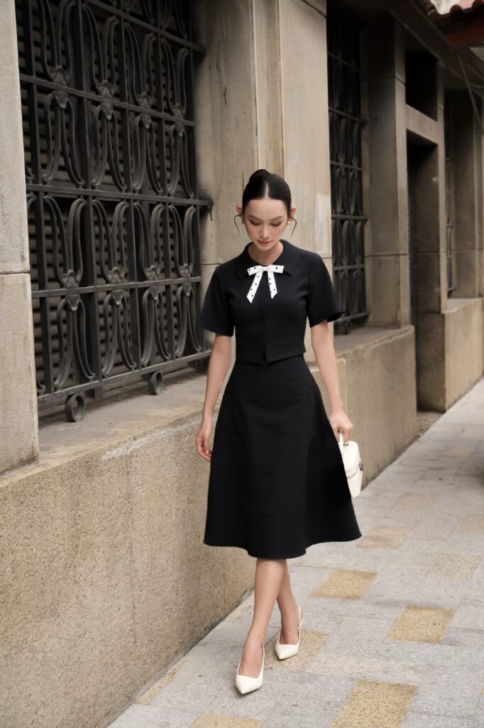 Bộ trang phục trong BST PreFall’25 là sự hòa quyện giữa phom dáng cổ điển và điểm nhấn hiện đại với thiết kế áo cổ tròn tay ngắn cùng chi tiết nơ chấm bi nổi bật, kết hợp cùng chân váy midi xếp tầng mềm mại, tạo nên tổng thể hài hòa đầy cuốn hút.