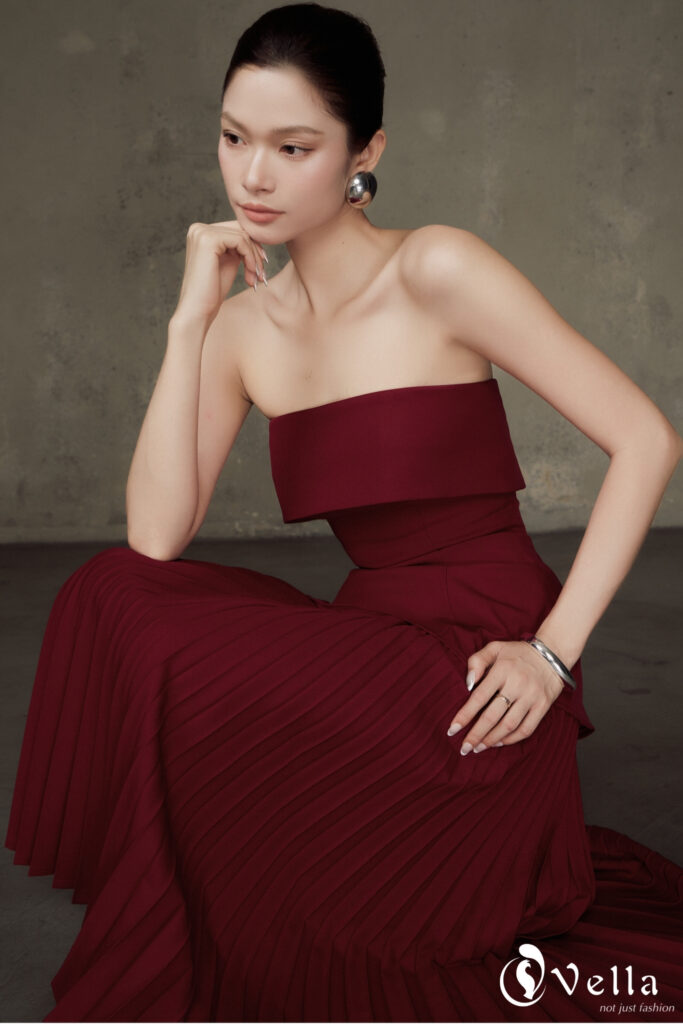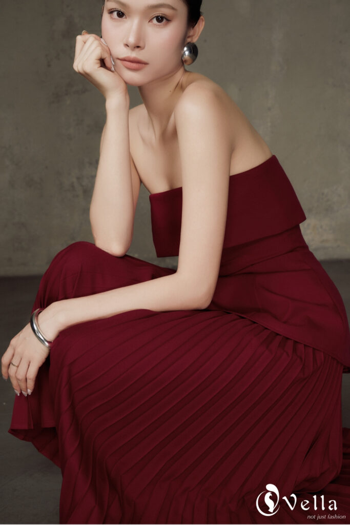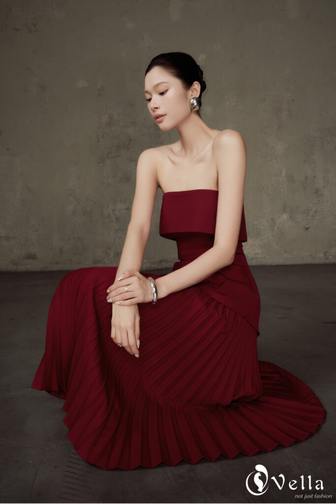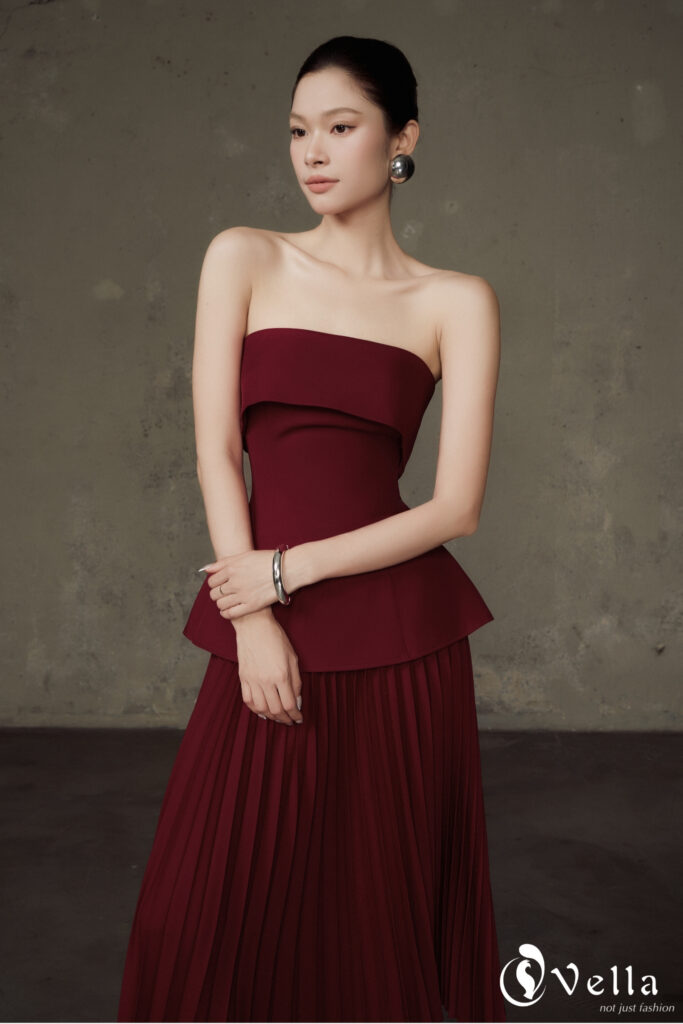 Trên nền gam đỏ burgundy trầm ấm, bộ outfit gồm áo peplum và chân váy xếp li rẽ quạt vừa đủ nổi bật cho những buổi tiệc tối, vừa phù hợp để diện trong các sự kiện trang trọng hay không gian sang trọng cuối năm.