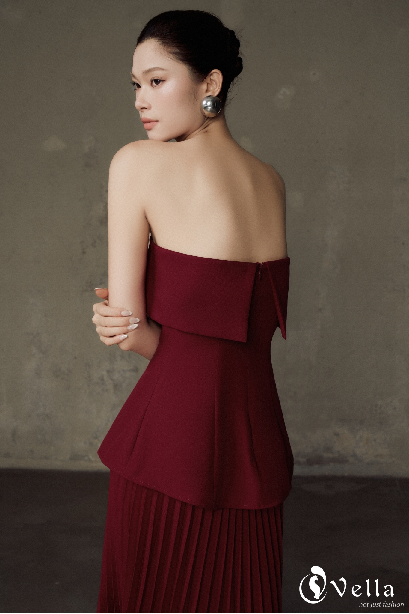 Trên nền gam đỏ burgundy trầm ấm, bộ outfit gồm áo peplum và chân váy xếp li rẽ quạt vừa đủ nổi bật cho những buổi tiệc tối, vừa phù hợp để diện trong các sự kiện trang trọng hay không gian sang trọng cuối năm.