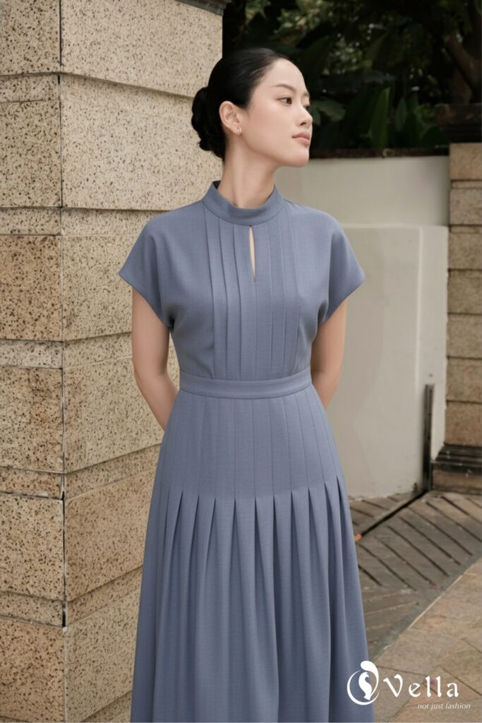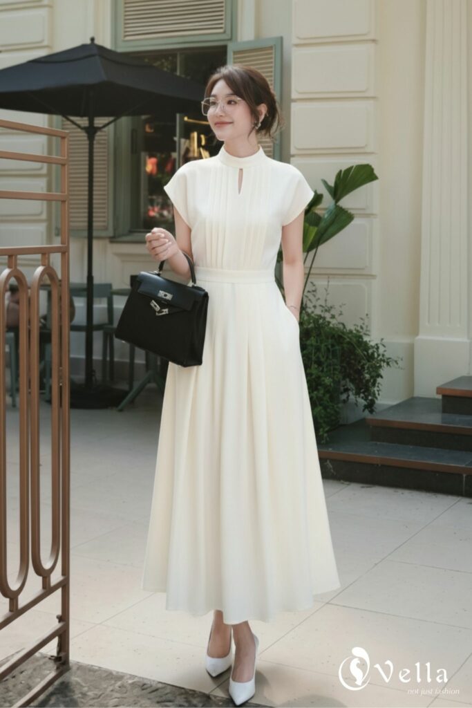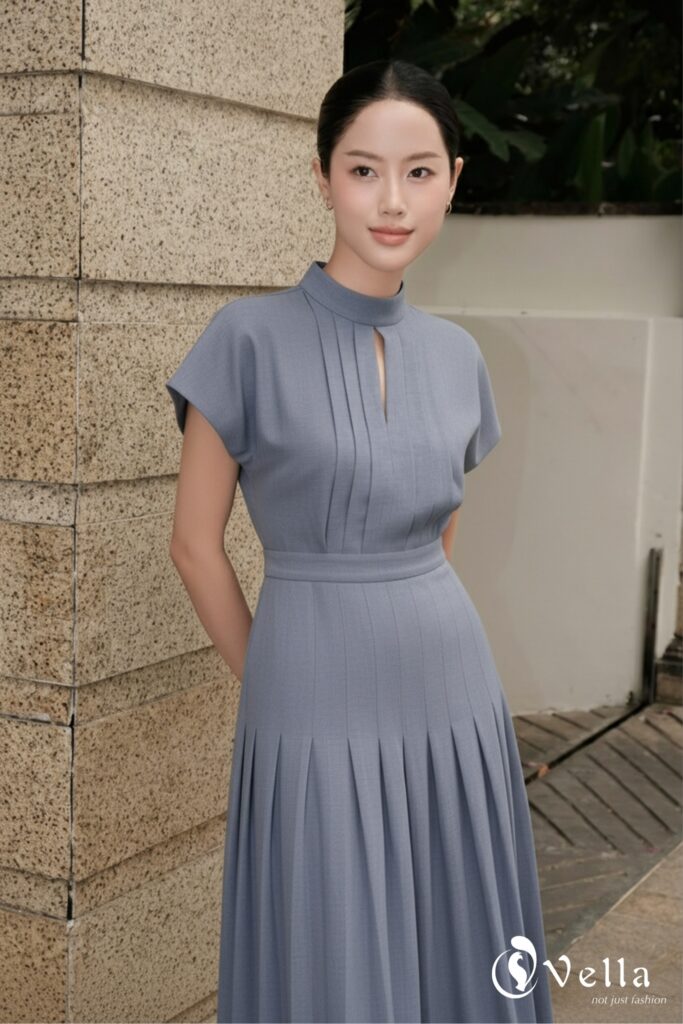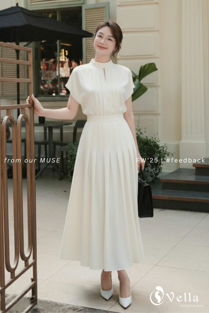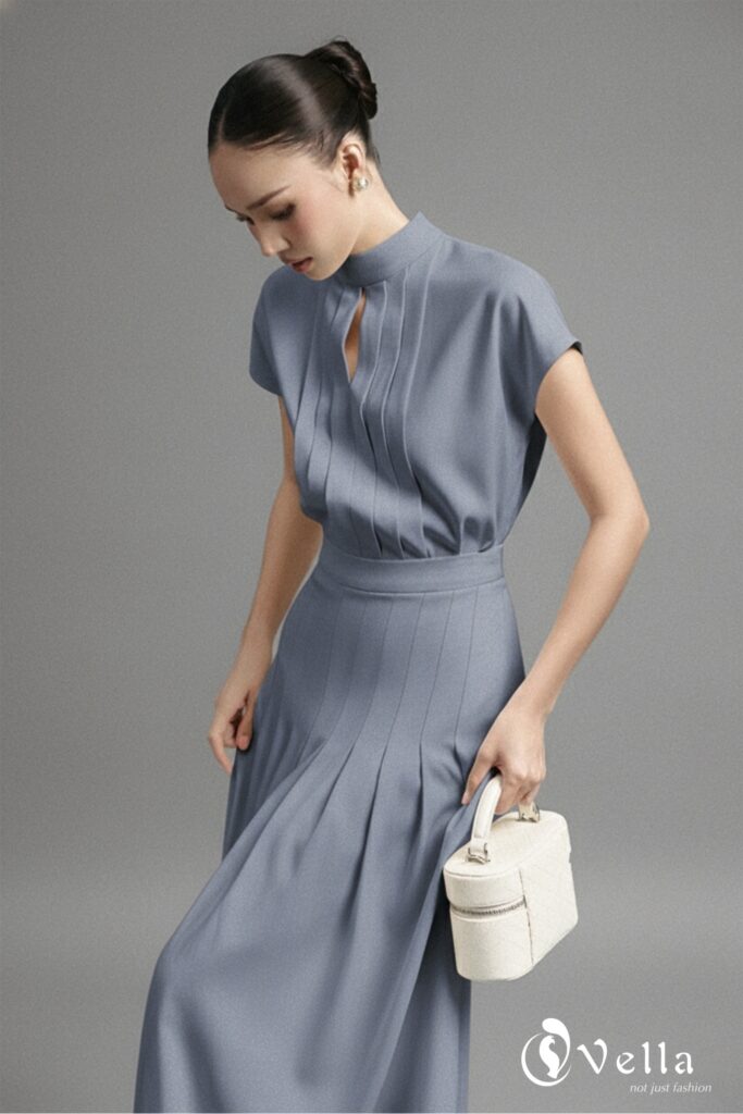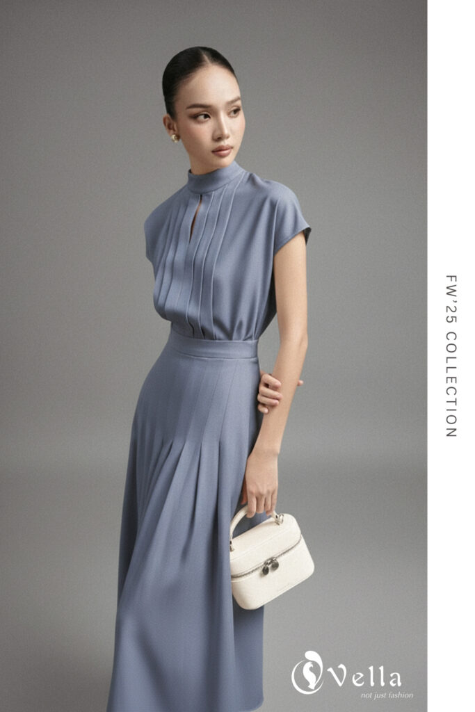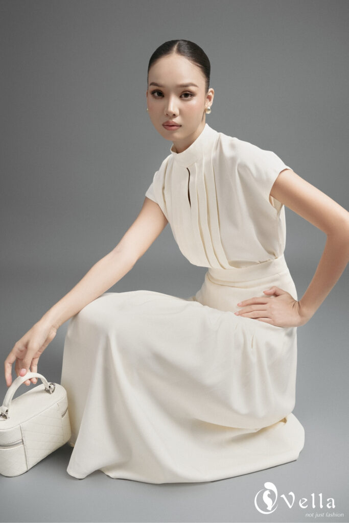 Kết hợp cùng chân váy midi xếp ly mềm rũ để mỗi bước đi, mỗi dáng đứng đều trở nên có chiều sâu – phản chiếu hình ảnh người phụ nữ tự tin, độc lập và luôn biết cách khiến bản thân tỏa sáng theo cách riêng.