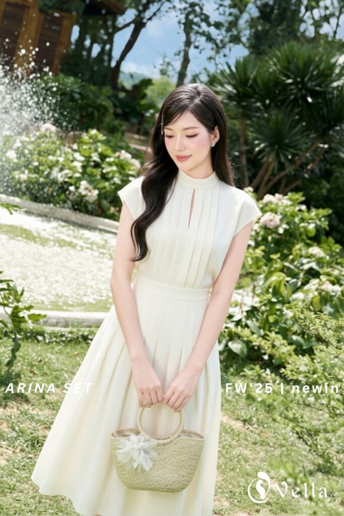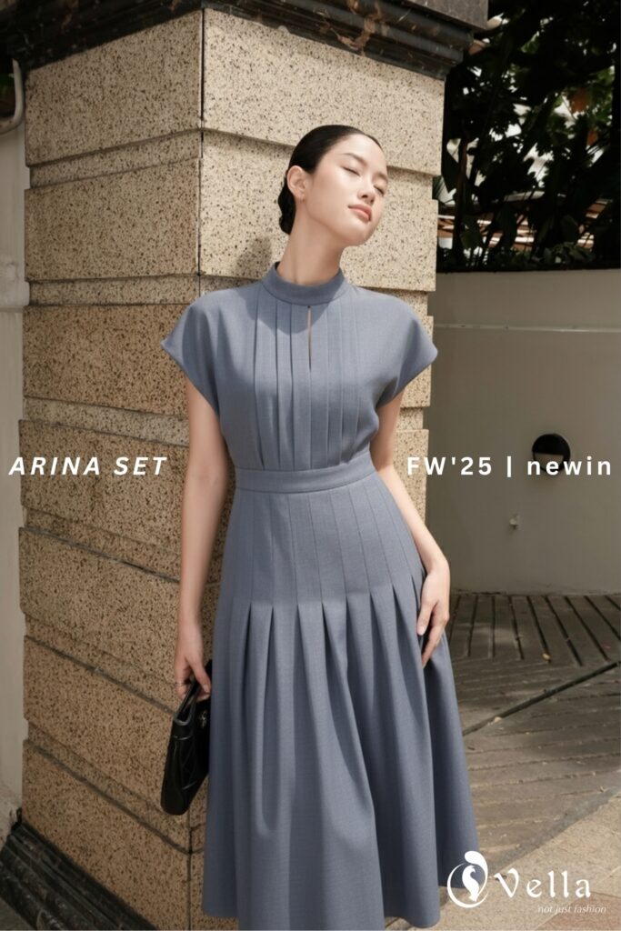 Trong BST FW’25, ARINA set đại diện cho phong thái của người phụ nữ thành thị – điềm tĩnh, tinh tế nhưng vẫn ẩn chứa sức hút riêng. Gam xám xanh dịu mắt mang lại sự cân bằng giữa hiện đại và cổ điển, là sắc độ của những ngày Thu Đông – an yên mà vẫn đầy khí chất.