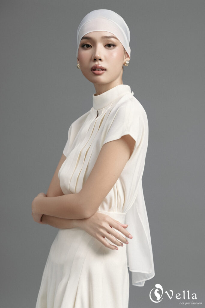 Thiết kế ARINA top gây ấn tượng bởi phom áo tay dơi thanh thoát cùng những đường xếp li bản lớn chạy dọc phần thân trước tạo độ phồng tự nhiên. Đường cắt cut-out tinh tế ở cổ áo như điểm dừng vừa đủ cho một tổng thể kín đáo mà vẫn đầy gợi cảm.