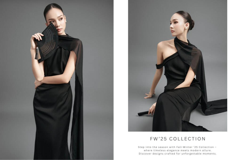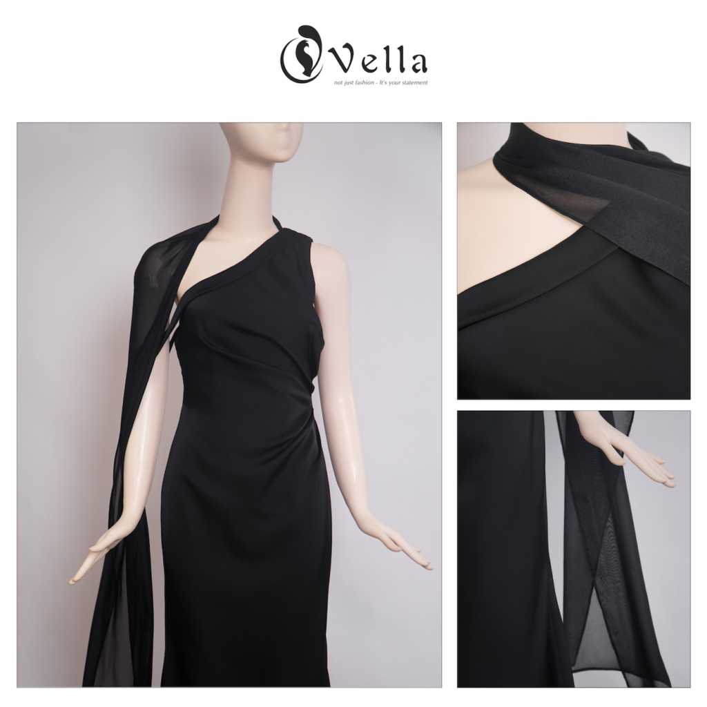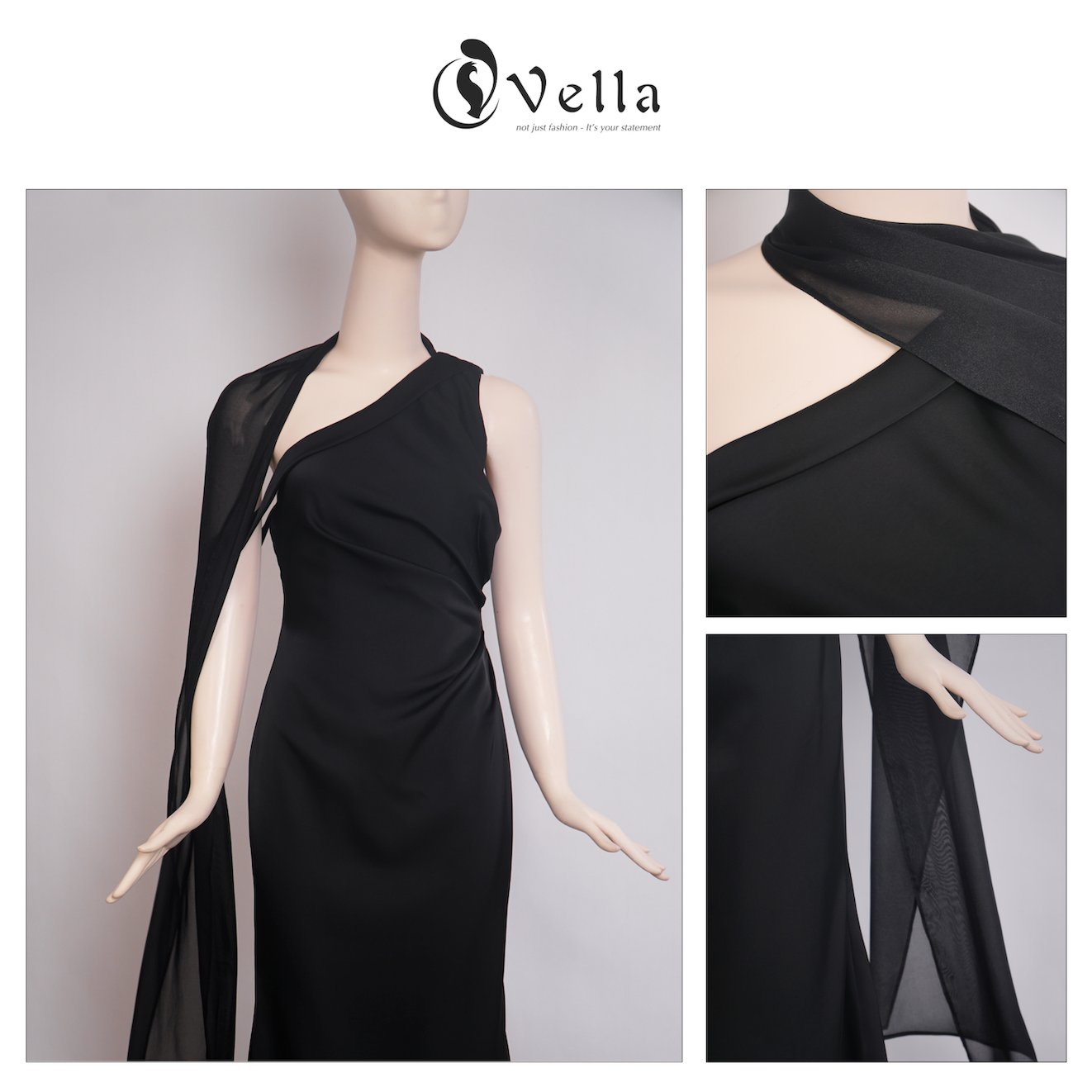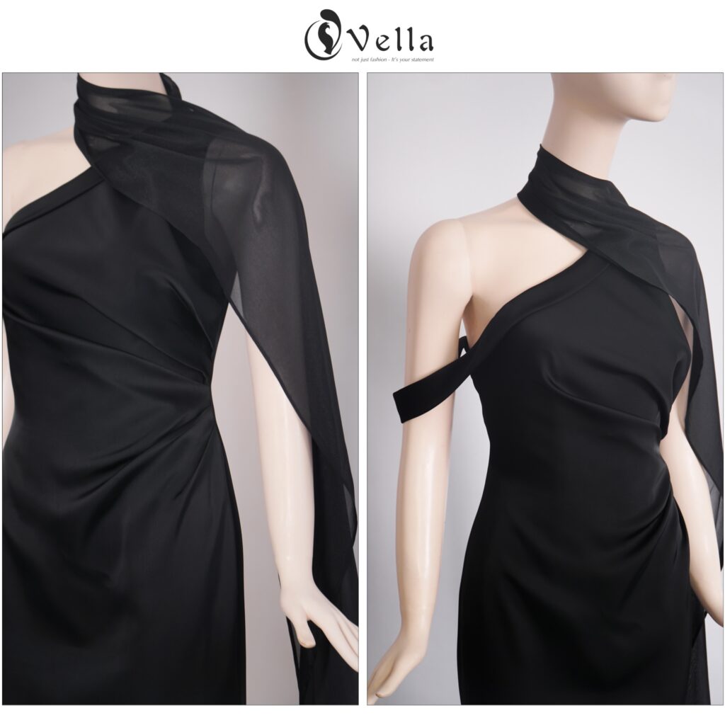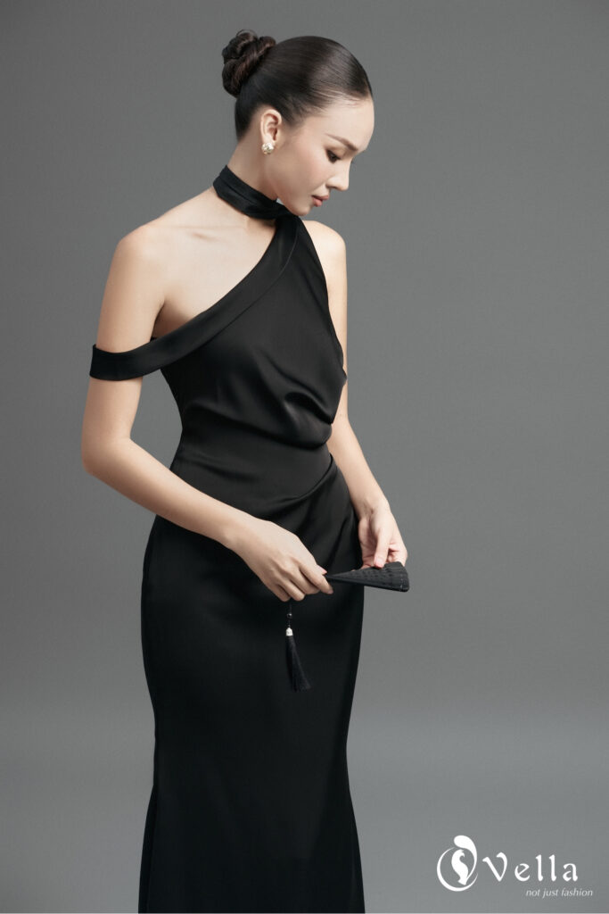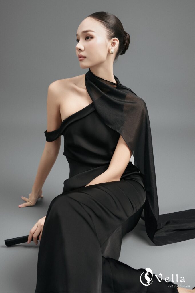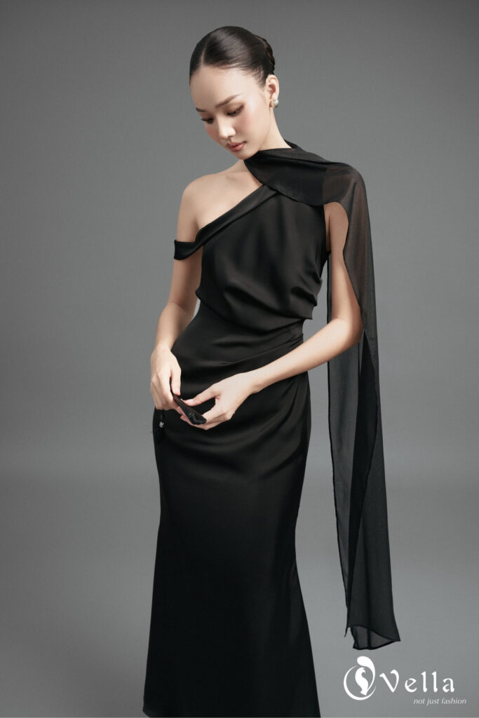 𝑩𝑳𝑨𝑪𝑲 𝑪𝑬𝑳𝑰𝑵𝑬 dress mang đến vẻ đẹp cuốn hút qua dáng lệch vai, vừa tôn trọn đường nét gợi cảm mà vẫn giữ sự thanh lịch tinh tế của người phụ nữ. Dải khăn choàng voan kiêu sa, thả rơi mềm mại theo từng bước chân tạo nên sức hút khó rời mắt.