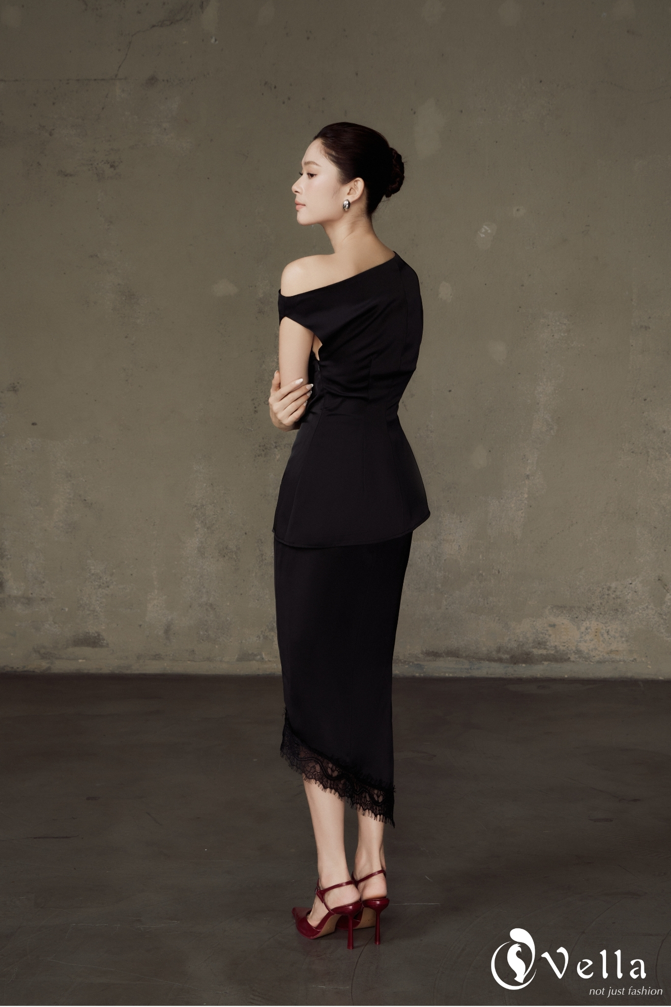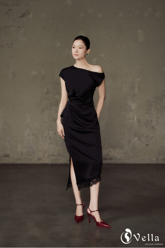 Đặc điểm nổi bật: áo peplum lệch vai, chân váy bút chì dáng dài, viền ren tinh xảo