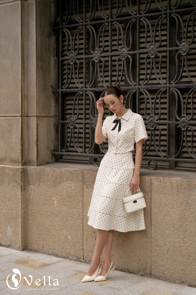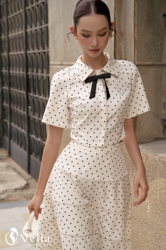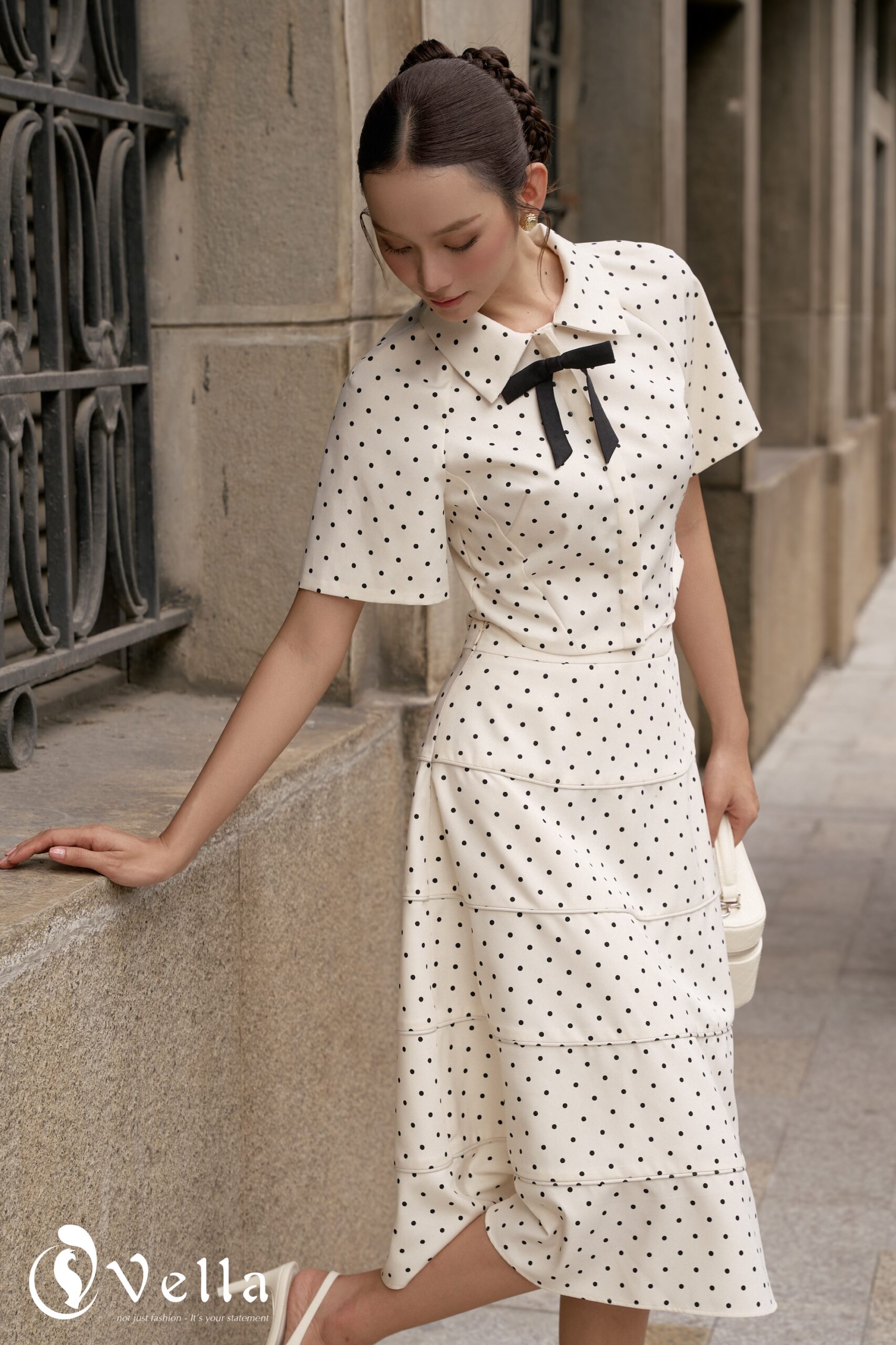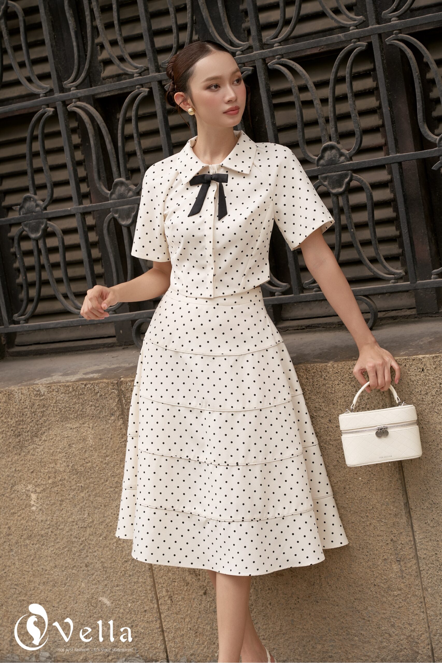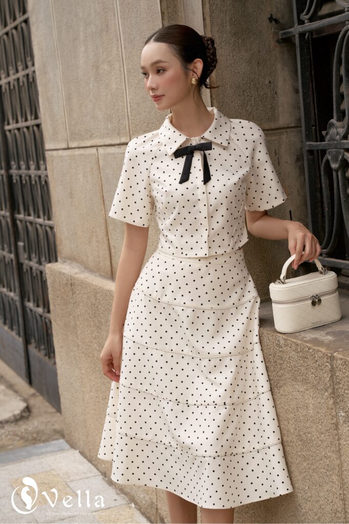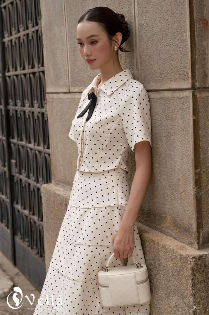 Với hoạ tiết chấm bi cổ điển, Vella mang đến một bản phối mềm mại và đầy nữ tính cho những quý cô yêu vẻ đẹp tinh tế.