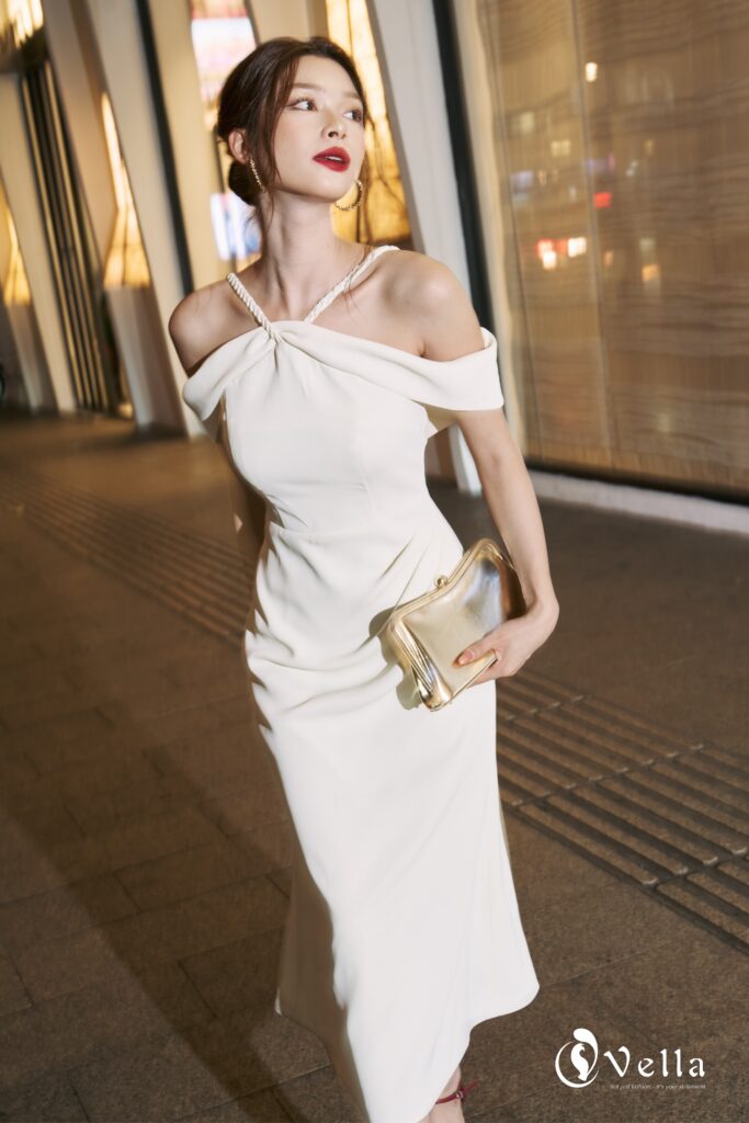 Đầm dự tiệc bèo vai dây tết xếp ly sườn VD24132 số lượng