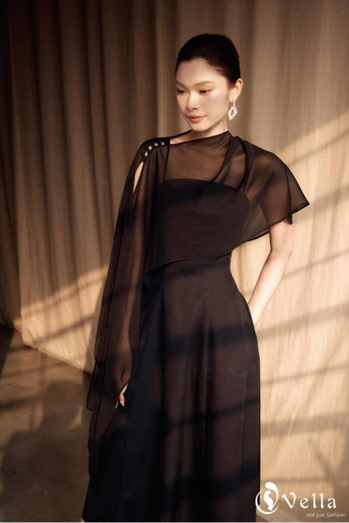 Điểm nhấn nằm ở áo choàng voan lệch vai, thiết kế rũ nhẹ che khéo phần bắp tay, tạo hiệu ứng chuyển động bay bổng và mềm mại. Chất liệu voan cao cấp giúp tổng thể trở nên thanh thoát, phù hợp cho các buổi dự tiệc, sự kiện cuối năm, tiệc cưới hoặc những dịp cần sự chỉn chu, tinh tế.