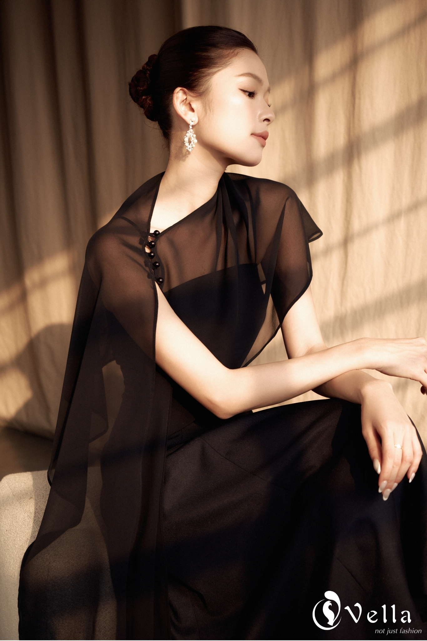 Điểm nhấn nằm ở áo choàng voan lệch vai, thiết kế rũ nhẹ che khéo phần bắp tay, tạo hiệu ứng chuyển động bay bổng và mềm mại. Chất liệu voan cao cấp giúp tổng thể trở nên thanh thoát, phù hợp cho các buổi dự tiệc, sự kiện cuối năm, tiệc cưới hoặc những dịp cần sự chỉn chu, tinh tế.