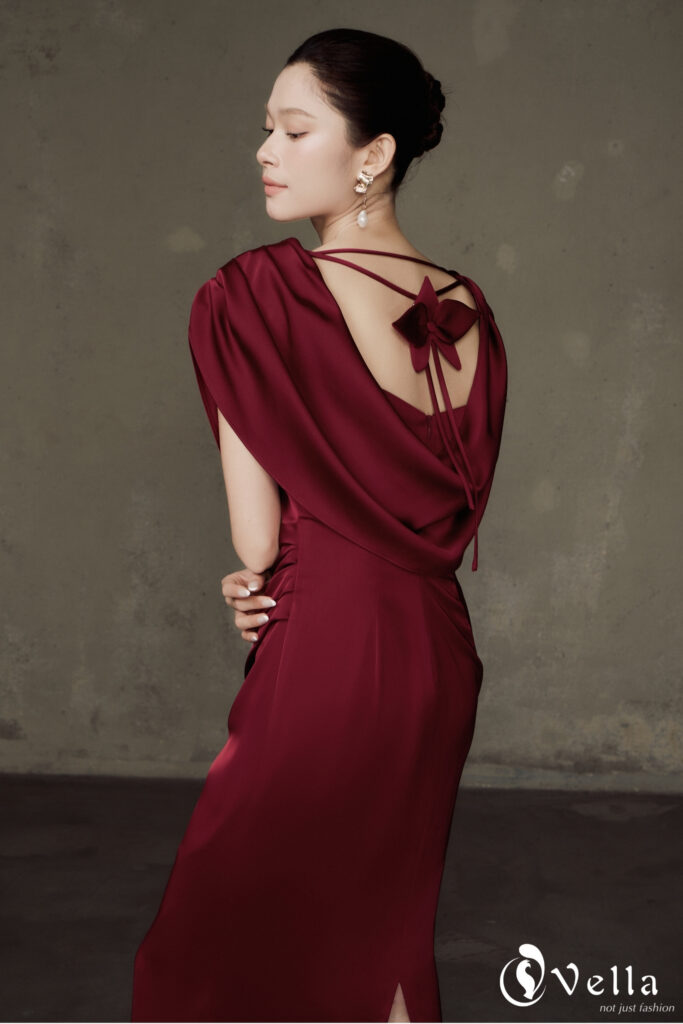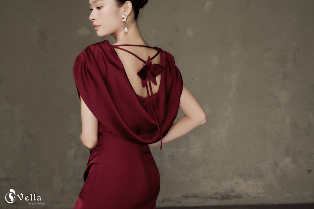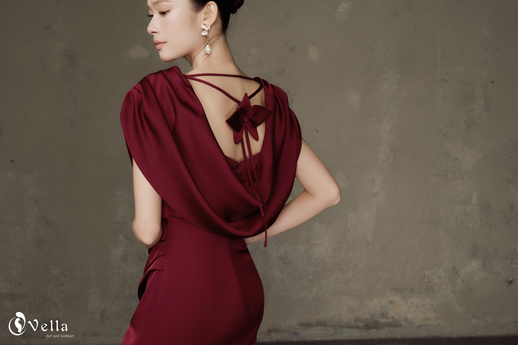 Điểm nhấn nổi bật nằm ở chi tiết nơ 3D thủ công nơi lưng áo, kết hợp cùng dây mảnh đan chéo, vừa gợi cảm vừa đủ kín đáo. Thiết kế lưng mở nhẹ giúp tổng thể trở nên cuốn hút, phù hợp với tinh thần sang trọng đặc trưng của Vella.