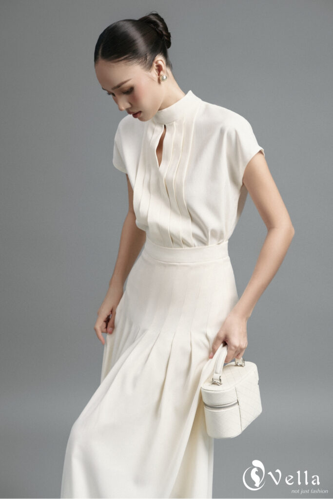 ARINA set mang đến một vẻ đẹp thanh lịch và tinh giản với áo cổ cao xếp ly dọc, chi tiết cut–out nhỏ nhắn đầy duyên dáng và mềm mại. Chân váy midi dáng xòe với những đường xếp ly tôn lên nét duyên dáng và nữ tính tự nhiên.